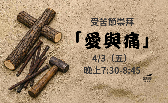6. 受苦節崇拜「愛與痛」: 因為愛,耶穌可以忍受十架上的痛苦;因為祂的憂患,我們學懂真正的愛。 中文堂受苦節崇拜訂於4月3日星期五晚上7:30-8:45 在大堂舉行。英語及青少年崇拜將會同時間在MPR舉行。