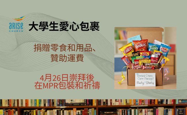 2. 大學生愛心包裹:教會在籌備送愛心包裹給我們大學及以上的學生。我們鼓勵你捐贈零食、物資和贊助郵費,請把零食和物資放在 大堂外指定位置。並在4月26日星期日崇拜完後在 MPR 與我們一 起包裝和祈禱。