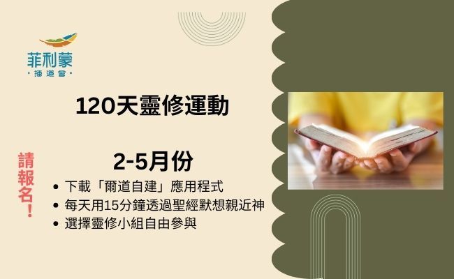 1. 「120天靈修運動」: 靈命塑造部在2-5月份,推動大家每天用15分鐘透過聖經默想親近神。鼓勵大家使用「爾道自建」應用程式,閱讀相關經文,並按指引默想神的話語。並可參加每週靈修小組交流默想心得,建立屬靈同行路。